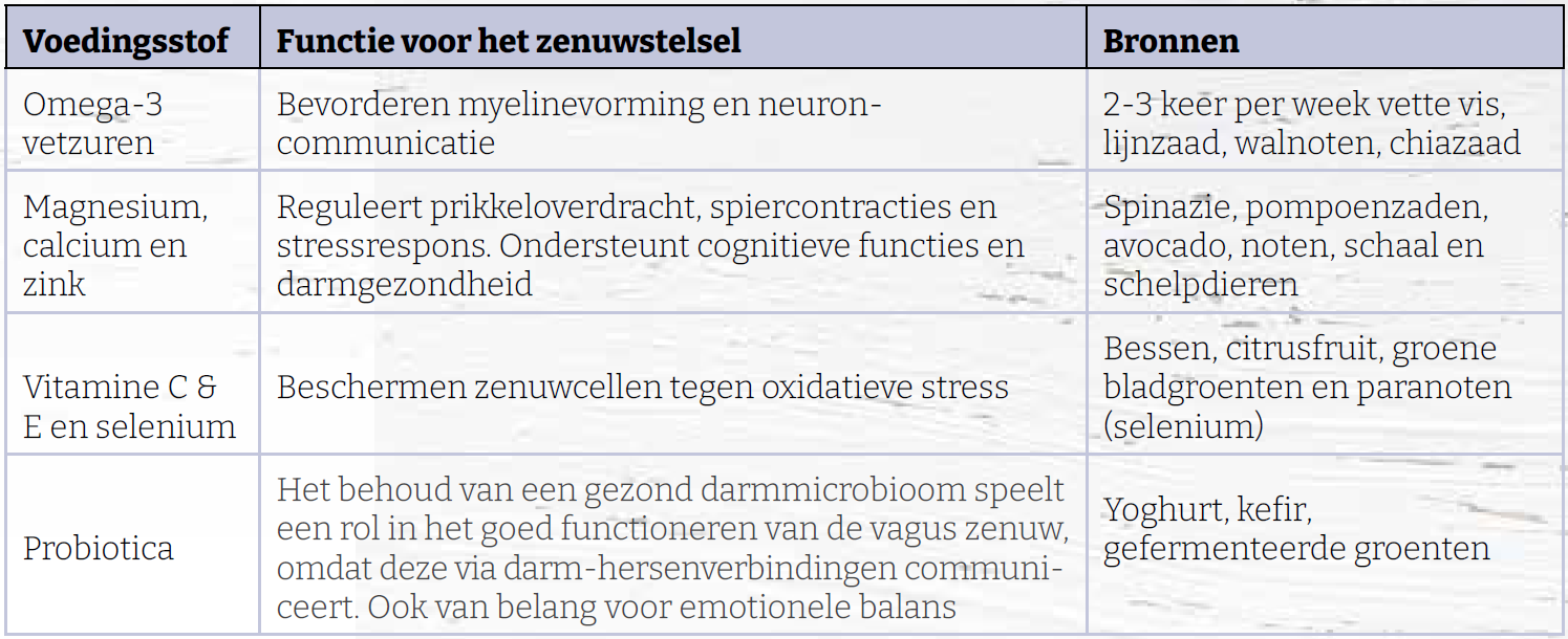 Goede bronnen zijn vlees, zuivel, eieren, groene bladgroenten, noten en volkoren producten. Mensen met een vegetarisch of veganistisch eetpatroon hebben vaak een tekort aan vitamine B12 waardoor suppletie hiervan wordt aangeraden. Naast de B vitamines zijn er nog een aantal voedingsstoffen essentieel voor een gezond zenuwstelsel.