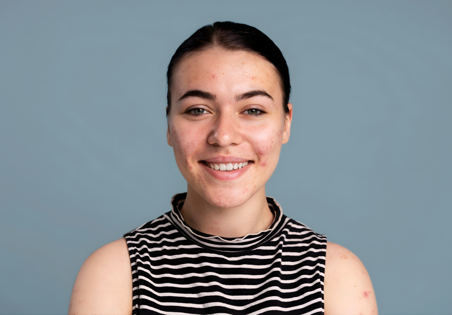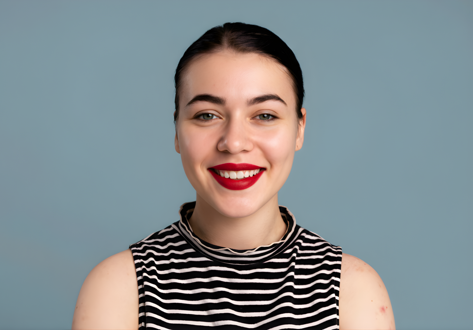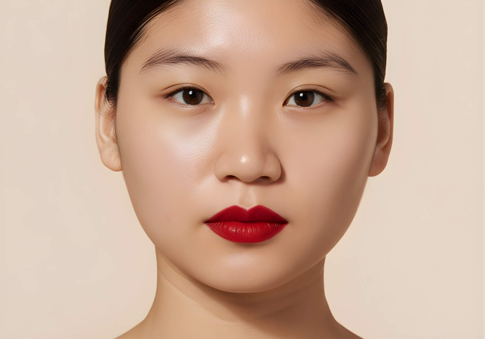 Prompt: deze persoon met een mooie egale huid en rode lippenstift.