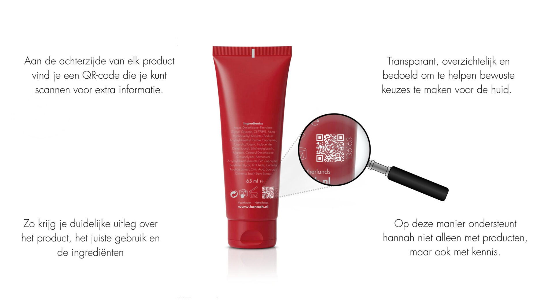 Nieuw binnen de productlijn is de QR-code op de achterzijde van ieder product. Via hannah.nl/info krijgen gebruikers direct toegang tot uitgebreide informatie over het product, de ingrediënten en het juiste gebruik.