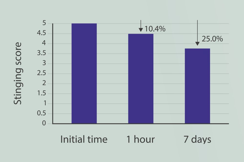 Zoals te zien in onderstaande afbeelding neemt de zogenaamde “stinging score” (= het prikken van de huid), of anders gezegd “de gevoeligheid van de huid” af, wanneer men gedurende een week regelmatig dit Oligopeptide aanbrengt. Deelnemers aan de test geven aan dat de crème daarom direct een verzachtend gevoel geeft, en jeuk, roodheid en irritatie significant verminderen.
